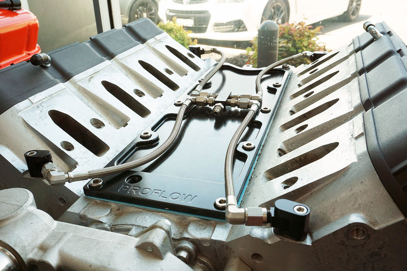 Proflow's LS water cross over kits eliminate trapped air and steam from your cylinder heads, preventing hot spots and overheating. This can cause head gasket failures, lean cylinders and pre-ignition. They connect to the vent ports on each corner of the cylinder heads (2 port or 4 ports options available), which is then routed to either the radiator or water pump. This kit includes stainless steel PTFE black braided hose and the appropriate fittings and distribution blocks for a simple installation. They also offer a more attractive look than the OE rigid hard lines and provide flexibility when using aftermarket intakes and other accessories on performance LS vehicles. Will not suit factory intake (requires 20mm of clearance under the manifold).