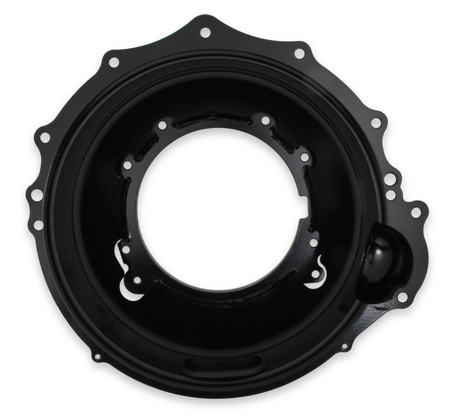 The Quick Time RM-9071 bellhousing connects Mopar 318/360 Engines to GM 4L60E Transmissions. This bellhousing is S.F.I. 30.1 certified which is required by many sanctioning bodies for cars running 11.49 or faster in the quarter mile. This bellhousing is a universal fit bellhousing and is not vehicle specific. The Quick Time bellhousings are produced using a unique spin forming process which results in a very high strength material. This high material strength allows the Quick Time bellhousings to be light weight while maintaining the protection you desire.