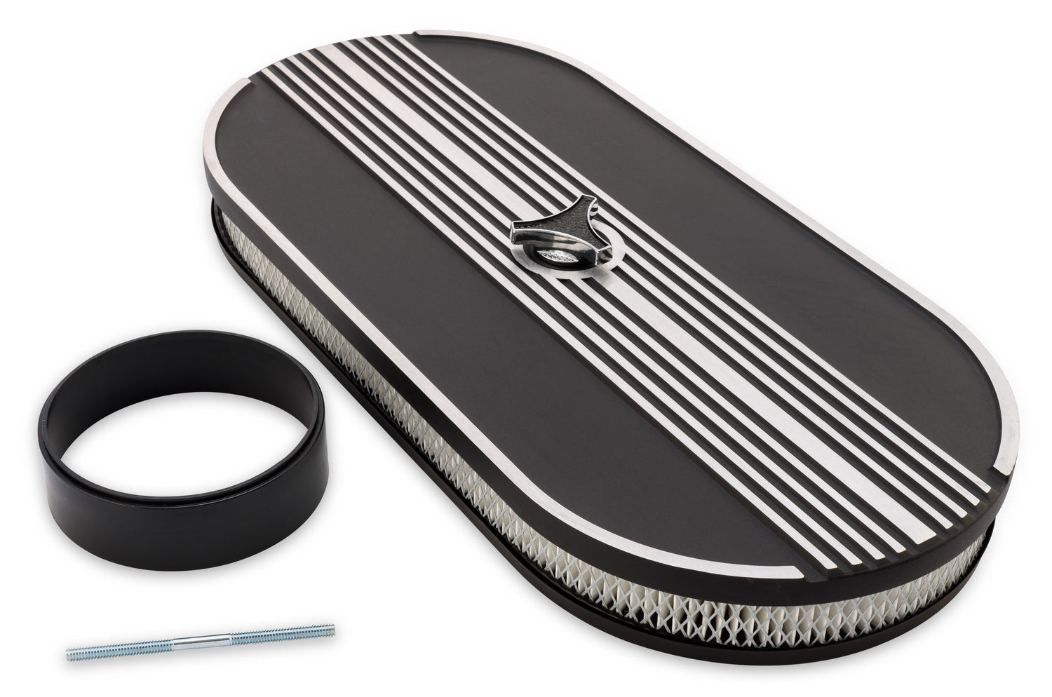 This high-quality, Concours reproduction air cleaner assembly includes a bottom single-carburetor plate, an air filter element, a carburetor stud, deluxe wing nut, and a carburetor spacer collar. Inspired by the 1960s Shelby Cobra design, this air cleaner comes in a vintage, oval shape and the sanded lines on the top edges emulates the original assemblies. This version of the cleaner comes without a logo, sporting an aluminum top and painted black. The measurements are 21 inches in length, 9-3/4 inches in width, and 2-1/16 inches in height. This direct-fit replacement air cleaner easily installs into the engine bay area of 1965-1973 Mustangs with a 2-barrel or 4-barrel carburetor. Simply remove your old, stock air cleaner and replace it with this brand-new Scott Drake version. Trimming may be required on the carburetor space collar.