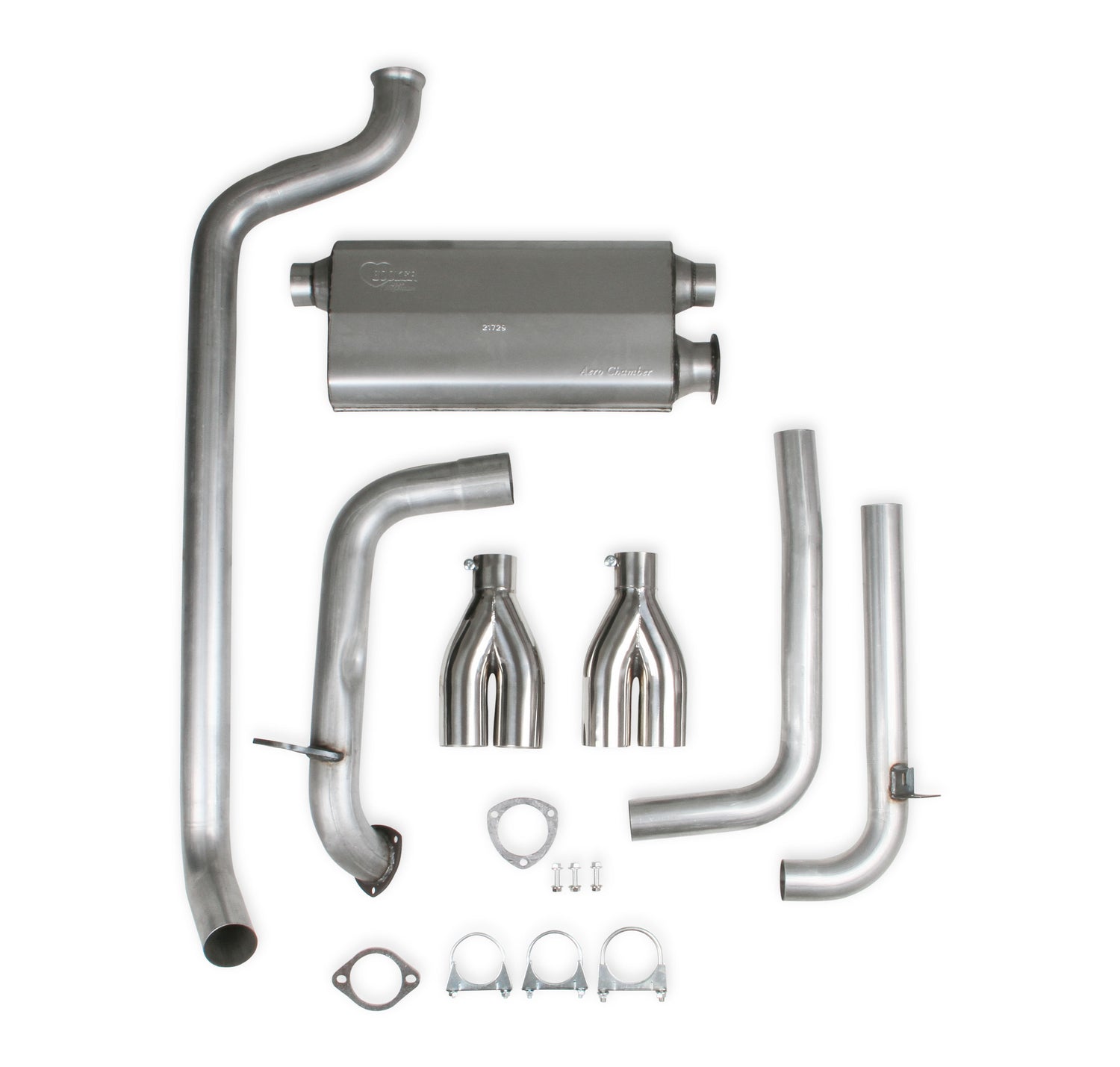 Brand Hooker Category Exhaust Emission Code 5 Exhaust Series Hooker Material Aluminized Steel Muffler Type Chambered Product Type Exhaust System Sound Level Aggressive Sub Category Exhaust and Tail Pipes System Type Cat-back Tips Dual 304 Stainless Tubing Diameter 2.5 Type of Exhaust Cat-Back Warning California Proposition 65 -